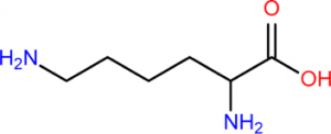 Tilsvarende ses aminosyren Lysin her med den primære amin-gruppe NH2 markeret med blåt til højre.